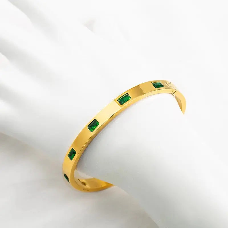 Stainless Steel Bangle Bracelet with Inlaid Green Stones – Non-Tarnish Finish